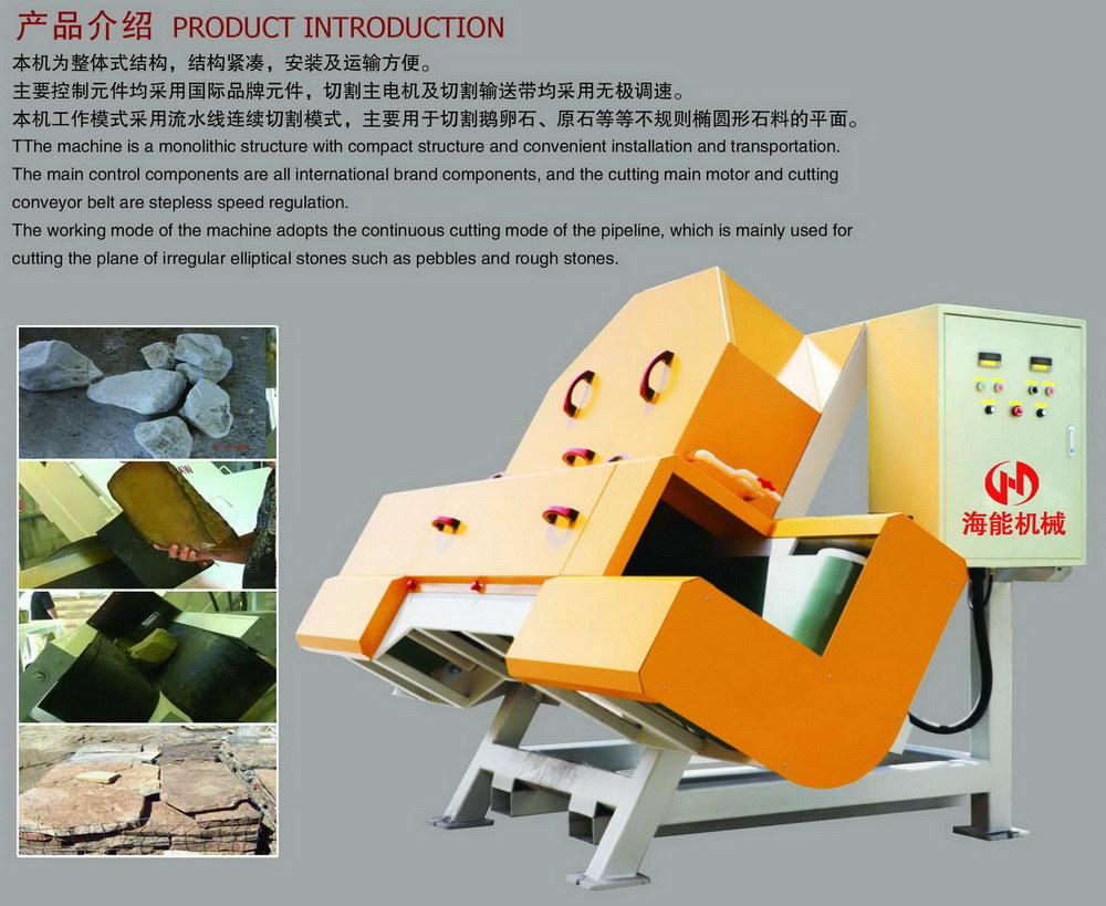 本机工作模式采用流水线连续切割模式,主要用于切割鹅卵石、原石等等不规则椭圆形石料的平面。